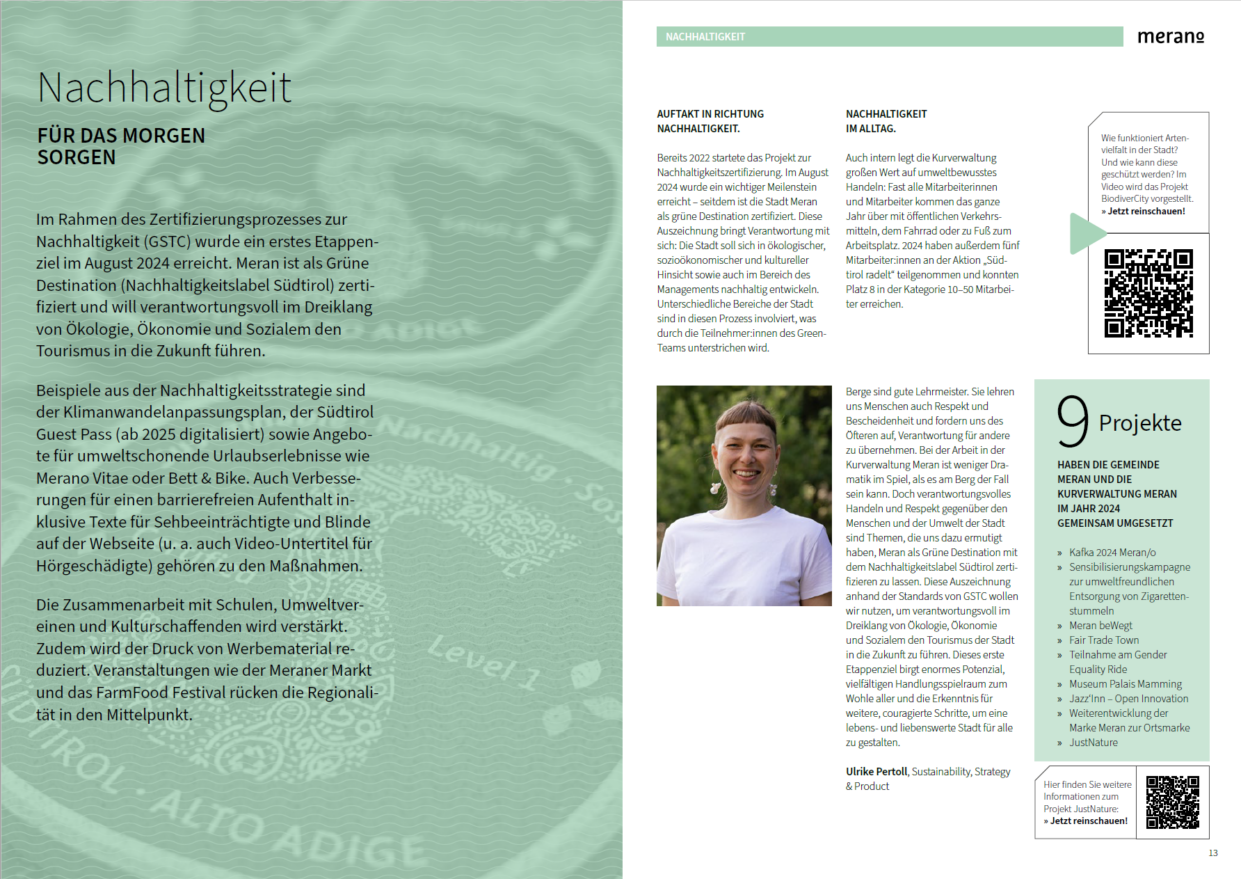 Angelehnt an das Design und Layout des Jahresberichts von IDM Südtirol wurde ein 28-seitiger Bericht im Corporate Design der Destination realisiert. Er gliedert sich in fünf Kapitel und kombiniert grafisch aufgearbeitete Kennzahlen mit informativen Kurztexten und persönlichen Statements der Mitarbeiter:innen. Verlinkungen zu digitalen Inhalten mittels QR-Codes ermöglichen eine vertiefende Lektüre oder Anmeldungen zu Newslettern.