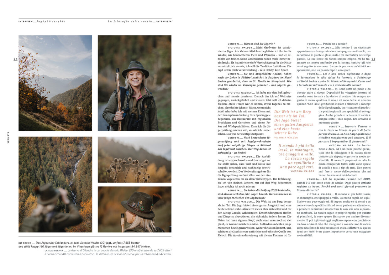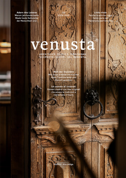 Die Ausgabe Nr. 13 des Vinschger Gästemagazins venusta erzählt von der besonderen Beziehung zwischen dem Vinschgau und seinem Wasser und wandert entlang eines Waalwegs durch Natur und Geschichte. Sie trifft drei Menschen, die Visionen verwirklichen und Veränderung vorantreiben, indem sie die Dörfer retten, Gasthäuser neu denken, Taler in Filmkulissen verwandeln. Eine Jägerin erklärt, warum Jagd Verantwortung bedeutet und warum es ihr nicht ums Schießen geht. Das Magazin besucht außerdem einen jungen Musiker, taucht in den stillen Winter ein, entdeckt altes Handwerk und Bräuche wieder und zeigt das Tal wie immer in all seinen Facetten.